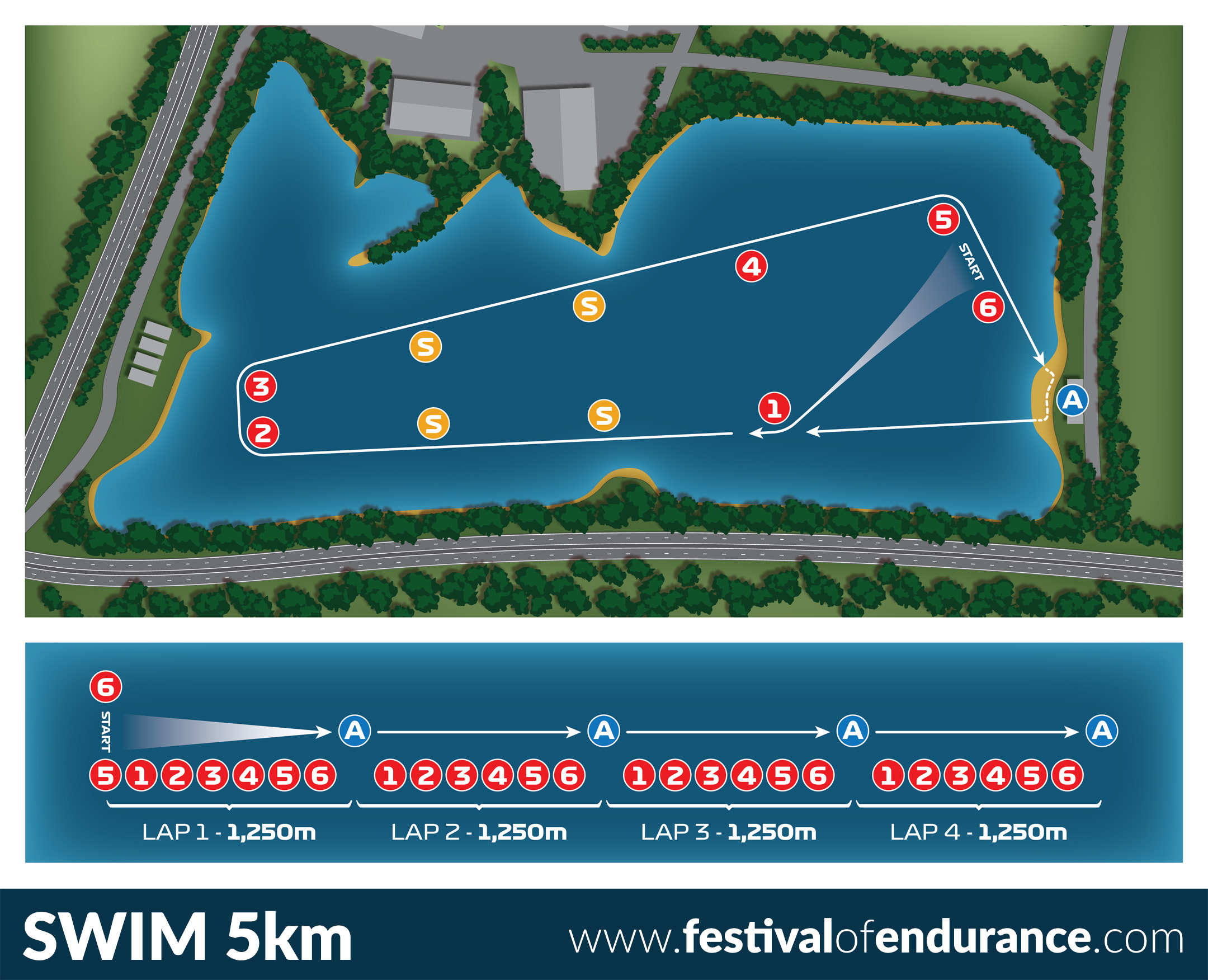 The swim will take place at Chichester Watersports at Westhampnett Lake, starting alongside the 255 Triathlon at 6am. The swim route will consist of 4 laps of 1,250m. After each lap, you will exit the water, providing a great spectator experience and an opportunity to take on nutrition.